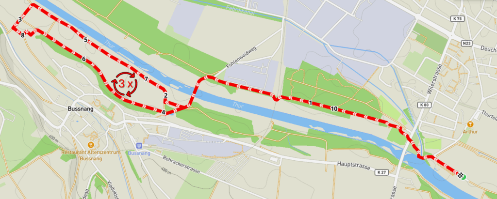 Selbes Streckenlayout wie bei der 6 km Laufstrecke, mit 3 Loops auf der Bussnanger Seite. Entsprechend 3 maliges passieren am Verpflegungsposten.
