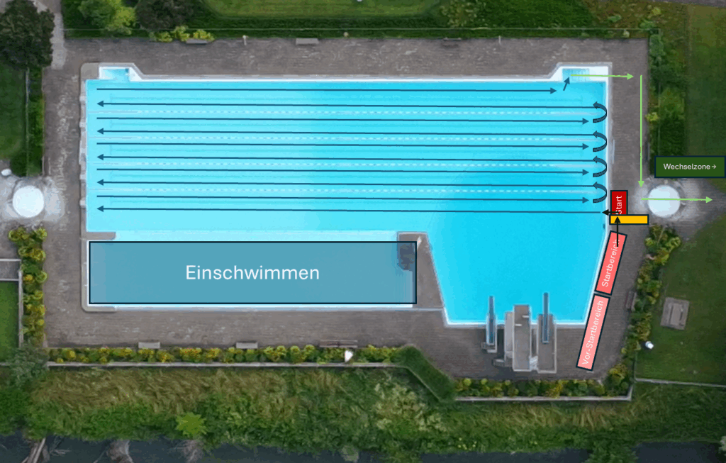 Die Schwimmstrecke wird im Thurbad Weinfelden absolviert. Das Startverfahren erfolgt dabei als Rolling Start, bei dem alle 5 Sekunden ein Start erfolgt.